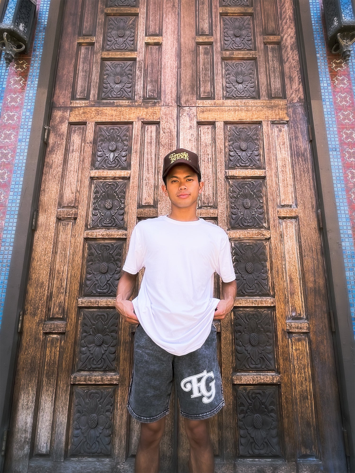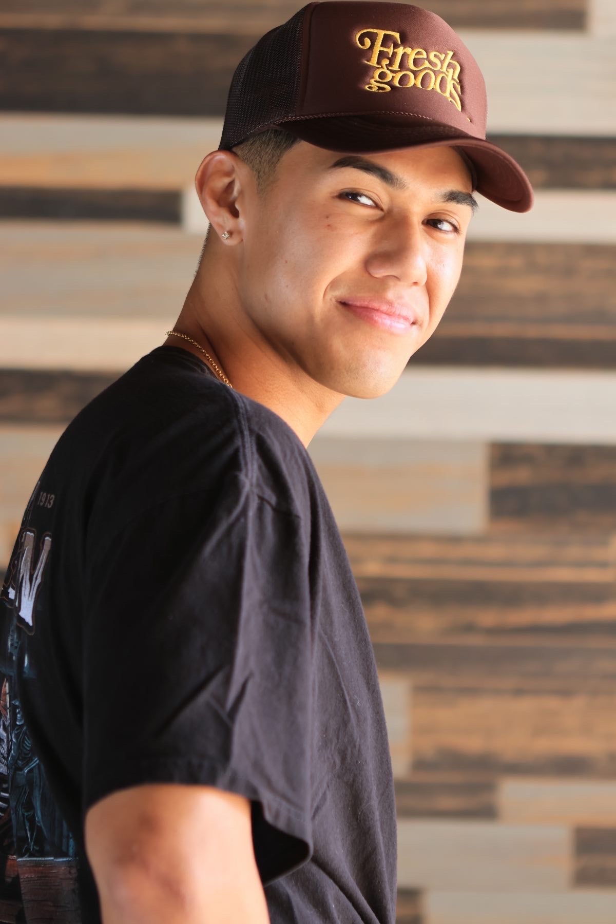 5 panel trucker hat. High Crown. Mesh Back. Fresh Goods embroidery.